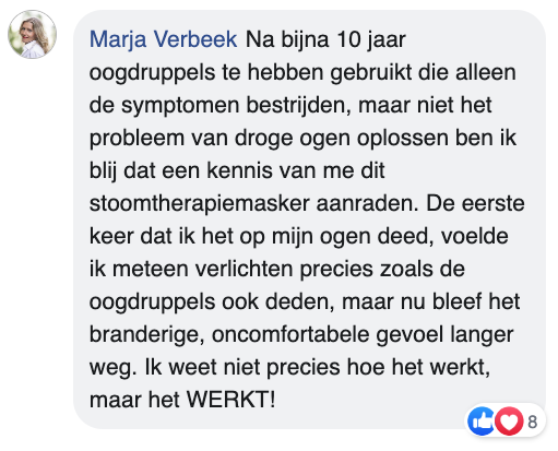 In tegenstelling tot oogdruppels, die gemiddeld €120 per jaar kosten en de oorzaak van het probleem niet aanpakken, kost ons stoomtherapie masker eenmalig €90 (vandaag)